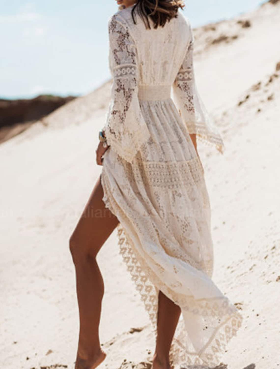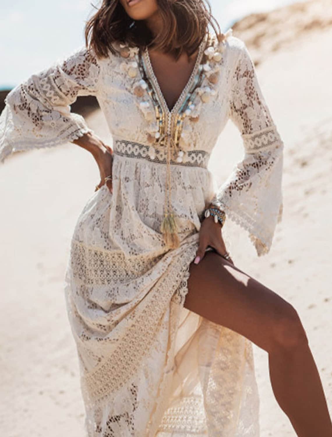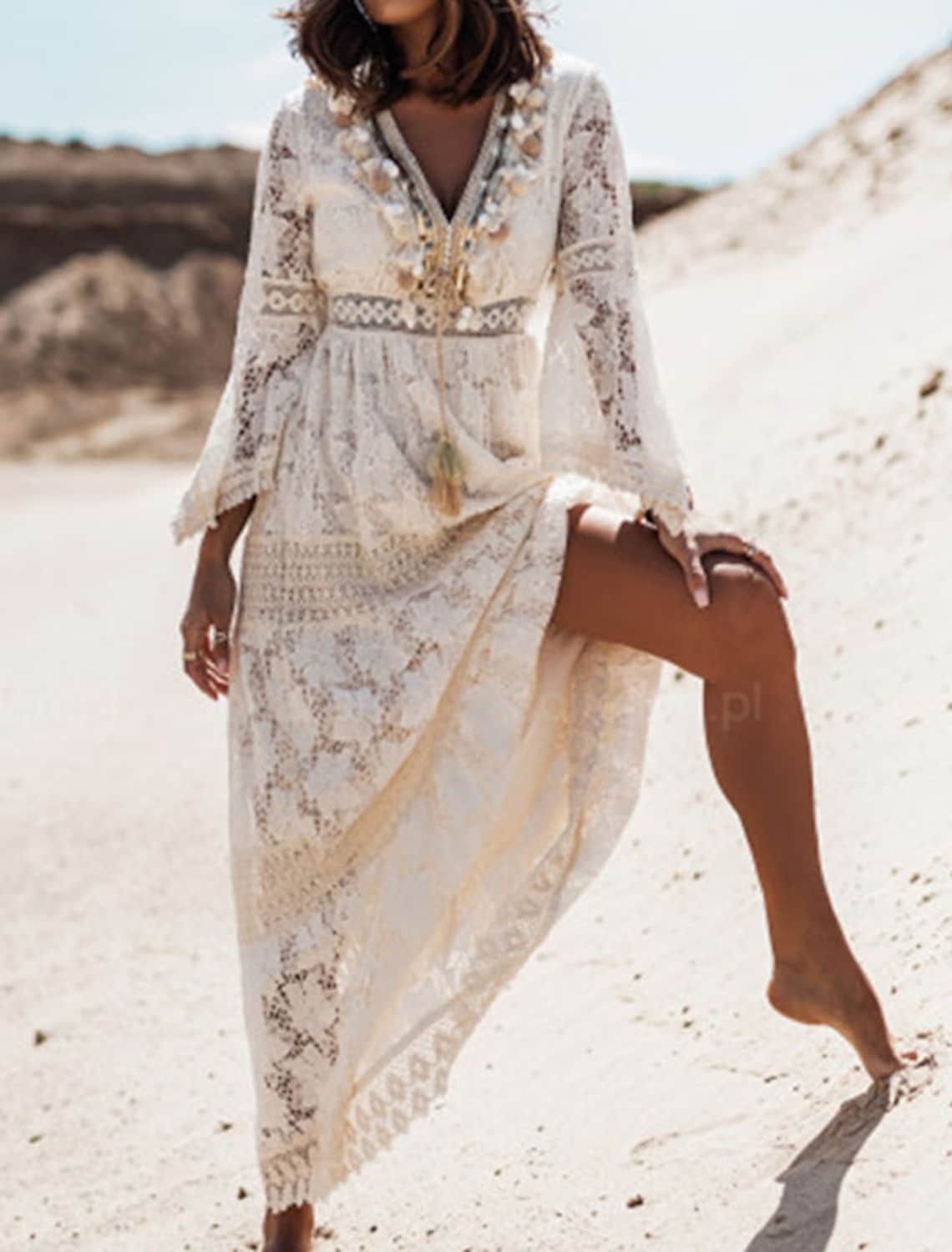 Waga Produktu: 0,38kgDługość Rękawa: Długi RękawStyl: Luźny, Szykowny, PodstawowyTyp: Prosty, Rozszerzenie, WarstwowyTyp Wzoru: Gładki, KwiatowyRodzaj Dekoltu: W SerekDługość: MaxiOkazja: WakacjeDetale: Kontrastowa Koronka, Tkanina Siatkowa, Haft