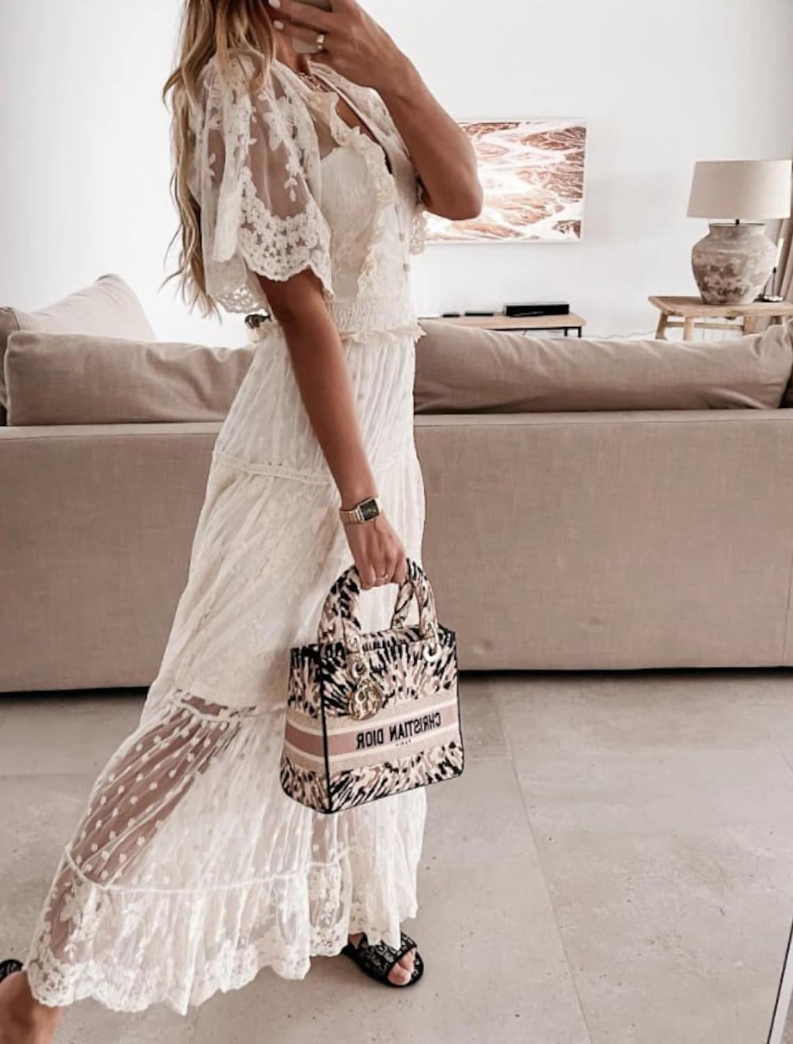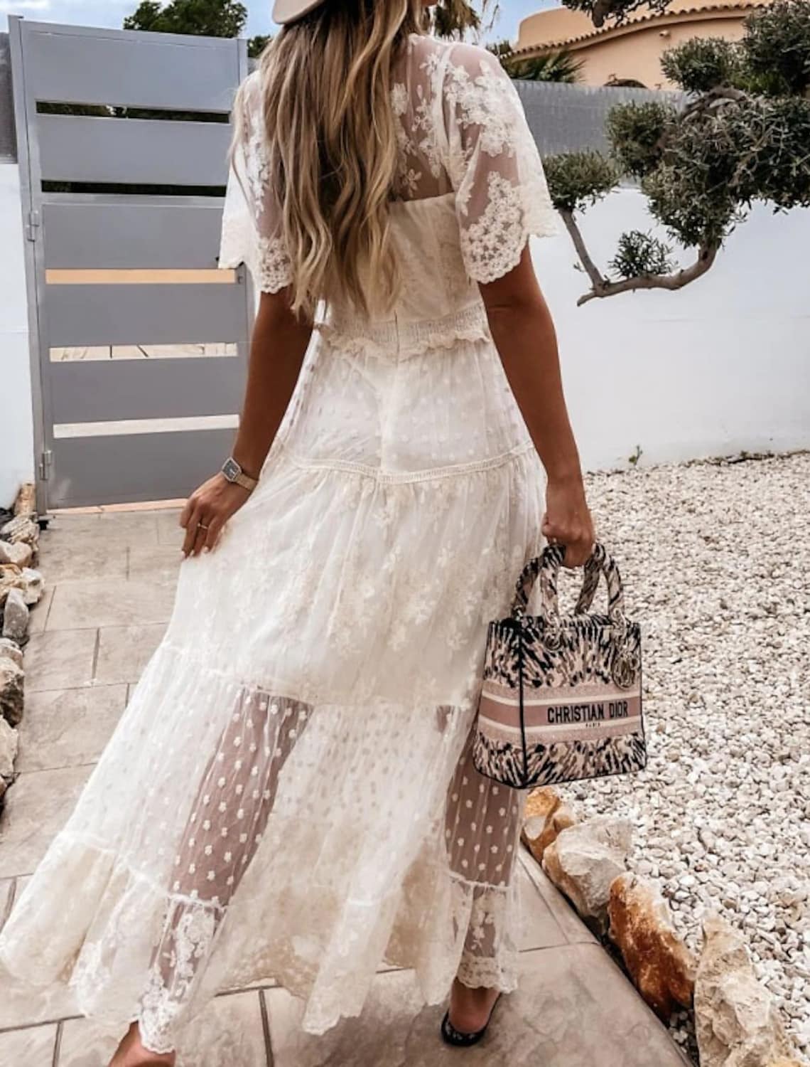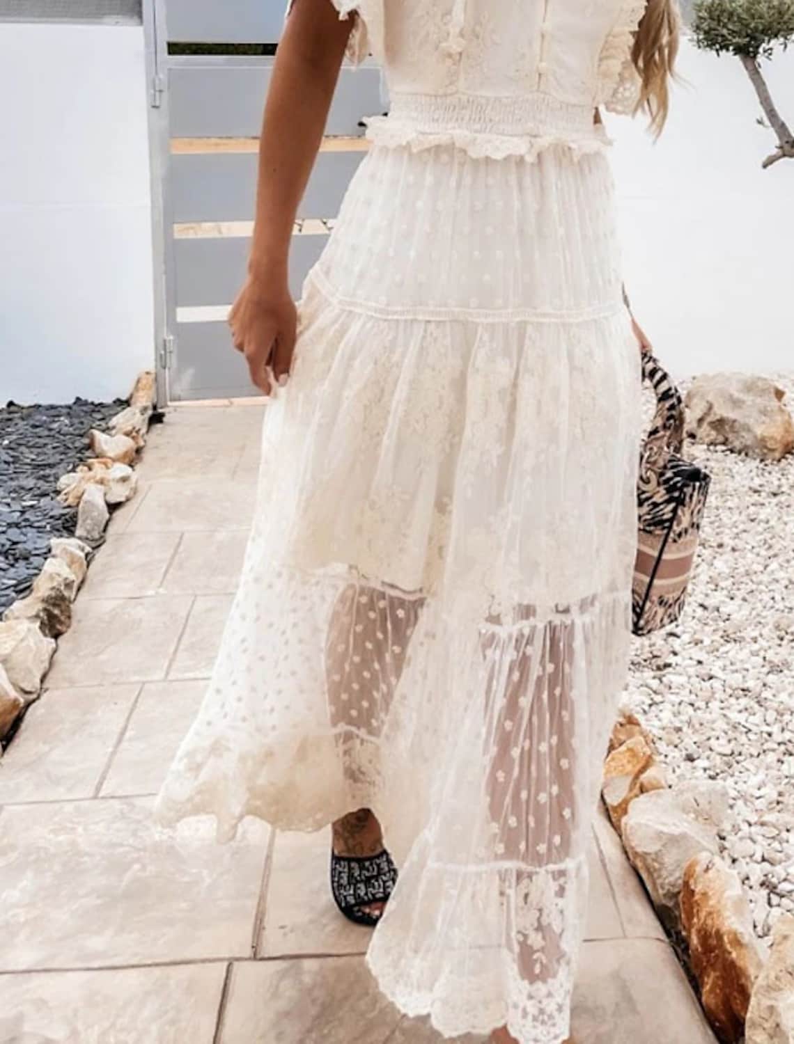 Waga Produktu: 0,4kgDługość Rękawa: Krótki RękawStyl: Luźny, Szykowny, Elegancki, PodstawowyTyp: Rozszerzenie, Rozkloszowany, WarstwowyTyp Wzoru: GładkiRodzaj Dekoltu: W SerekDługość: MaxiOkazja: Praca, WakacjeDetale: Falbany